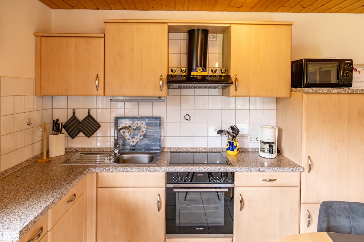 Küche: Kühlschrank mit Gefrierfach, Herd / Backofen, Mikrowelle, Spülmaschine, Kaffeemaschine, Wasser- / Eierkocher, Toaster